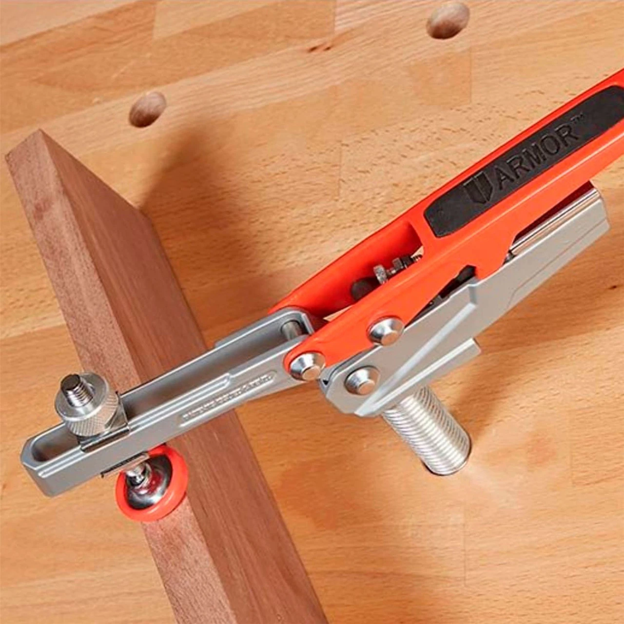 Armor Tool Auto-Adjust Horizontal Dog Clamp is fitted with a 19mm (3/4″) x 190mm (7-1/2″) spiral aluminium dog peg that inserts into a dog hole. This versatile clamp extends above the worktable surface and can rotate 360°, allowing for a wide range of clamping applications. Recommended minimum table thickness is 19mm (3/4″) for optimal clamping pressure and stability.