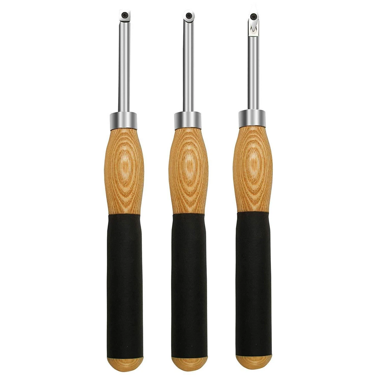 If you love woodturning but hate sharpening our mini turning tool set with carbide inserts is perfect for you. These tools eliminate the need for sharpening by using rotatable and replaceable carbide inserts mounted to steel shafts. When the edge of the cutter finally gets dull, simply rotate to a new edge and replace with a new insert when all edges are dull. Carbide cutters stay sharper for longer when compared to steel. The ergonomic handles are turned from solid Ash with a moulded rubber grip for a comfort and reducing fatigue.