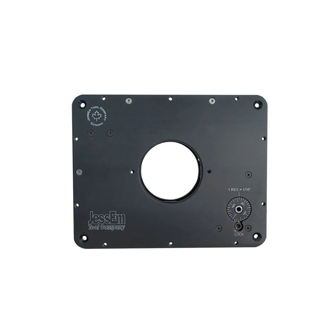 The 9.5mm thick-cast, precision ground and anodised black solid aluminium top plate is very strong and flat and will not flex or bend in use. The plate measures 235mm x 298mm and will accommodate large diameter cutters up to 90mm. All JessEm plates come with their own levelling system allowing for perfect alignment and levelling and fit our own JessEm and INCRA table tops or use our router insert plate template for home-made tables for a perfect fit.