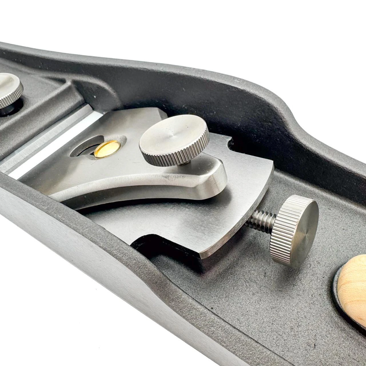 The Low Angle Jointing Plane features an easy to adjust, precise depth and lateral blade adjuster. Twist the knurled knob to set the depth of cut. Slide side to side to skew the blade within the plane mouth. The whole assembly comes apart easily for regular maintenance.