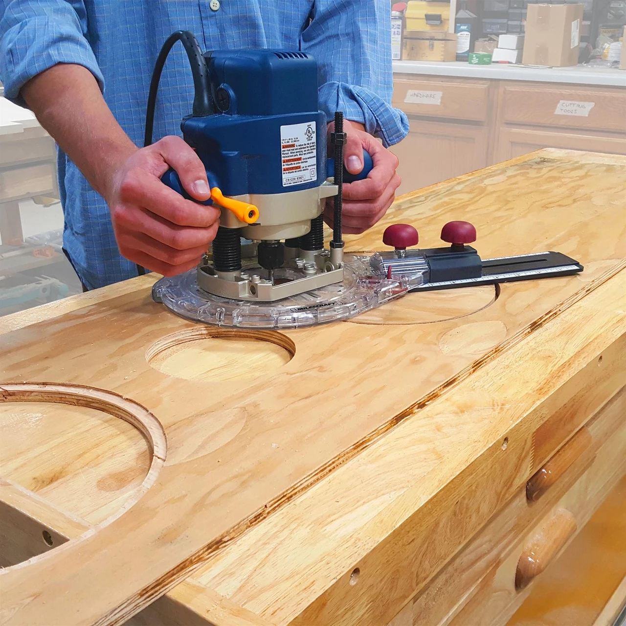 The CircleGuideKit™ includes everything needed to cut circles 1-1/2” (38mm) to 52” (1320mm) in diameter. The included TurnLock™ base plate is compatible with most routers and allows for quick jig setup. This router guide also includes a bonus Offset Base for finishing edges on your workpiece. Use a plunge router for best results.