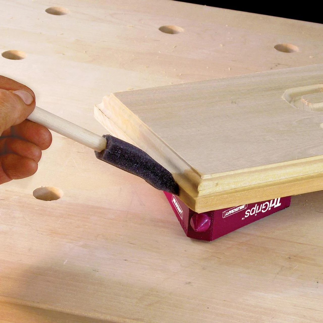 TriGrips non-slip work supports hold projects securely for routing, sanding, painting, drilling, carving, and more. The pads hold projects in place while elevating them 1-3/16″ above the work surface allowing complete access to edges while holding the project in place for painting and edge routing. Exclusive integrated painter’s points provide additional lift from the work surface and make minimal contact with fresh coats of paint or stain. Internal ballast ensures stability by allowing the centre of gravity to flow to the base in any position.