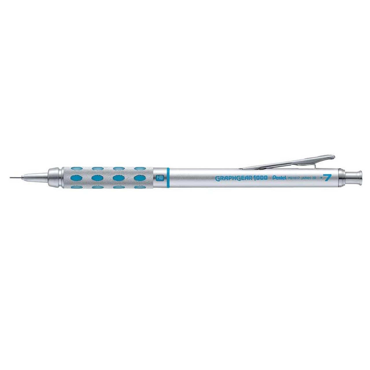 The Pentel Graphgear 1000 Automatic Pencil is a high-quality mechanical pencil with a well-balanced brushed steel barrel. Translucent rubber pips are set within the knurled finger body for a comfortable non-slip grip. The positive metal pocket clip also retracts the metal lead sleeve out of harm’s way when fully depressed, this protects the lead and sleeve and prevents damage when stored. Ideal for drawing, drafting and marking out where precision and accuracy are critical. Loosening the nib and rotating the coloured finger grip changes the lead grade indicator to remind the user what lead grade is loaded.