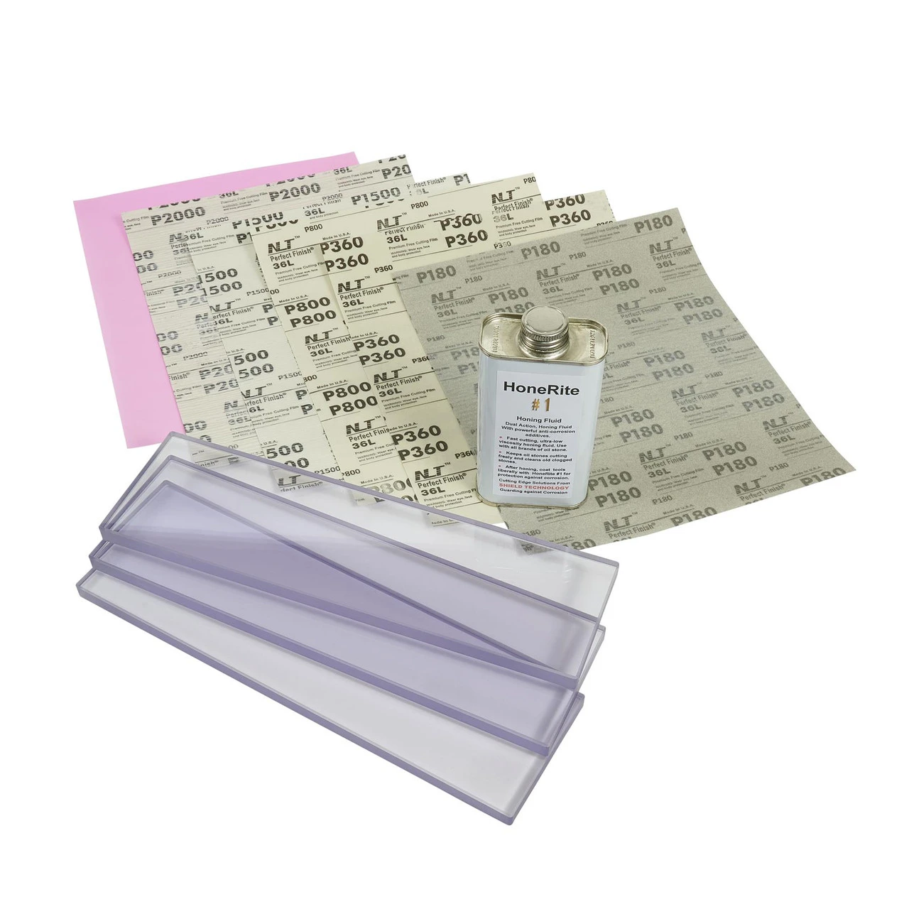 Our standard set contains our Scary Sharpening Polycarbonate Plates, Shield Technology HoneRite No 1 and Scary Sharpening Abrasive Papers.Â