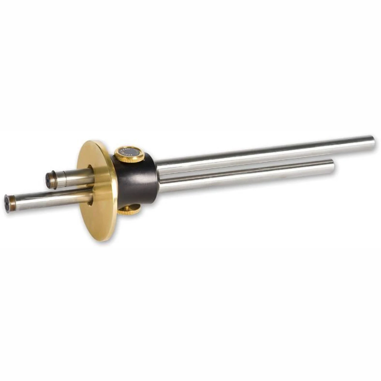 Projection is easy to set, an internal O-ring keeps light but constant friction on each rod; a thumbscrew locks the setting. One rod has its cutting edge at the extreme end of the rod, making it useful for transferring dimensions or as a depth gauge.
