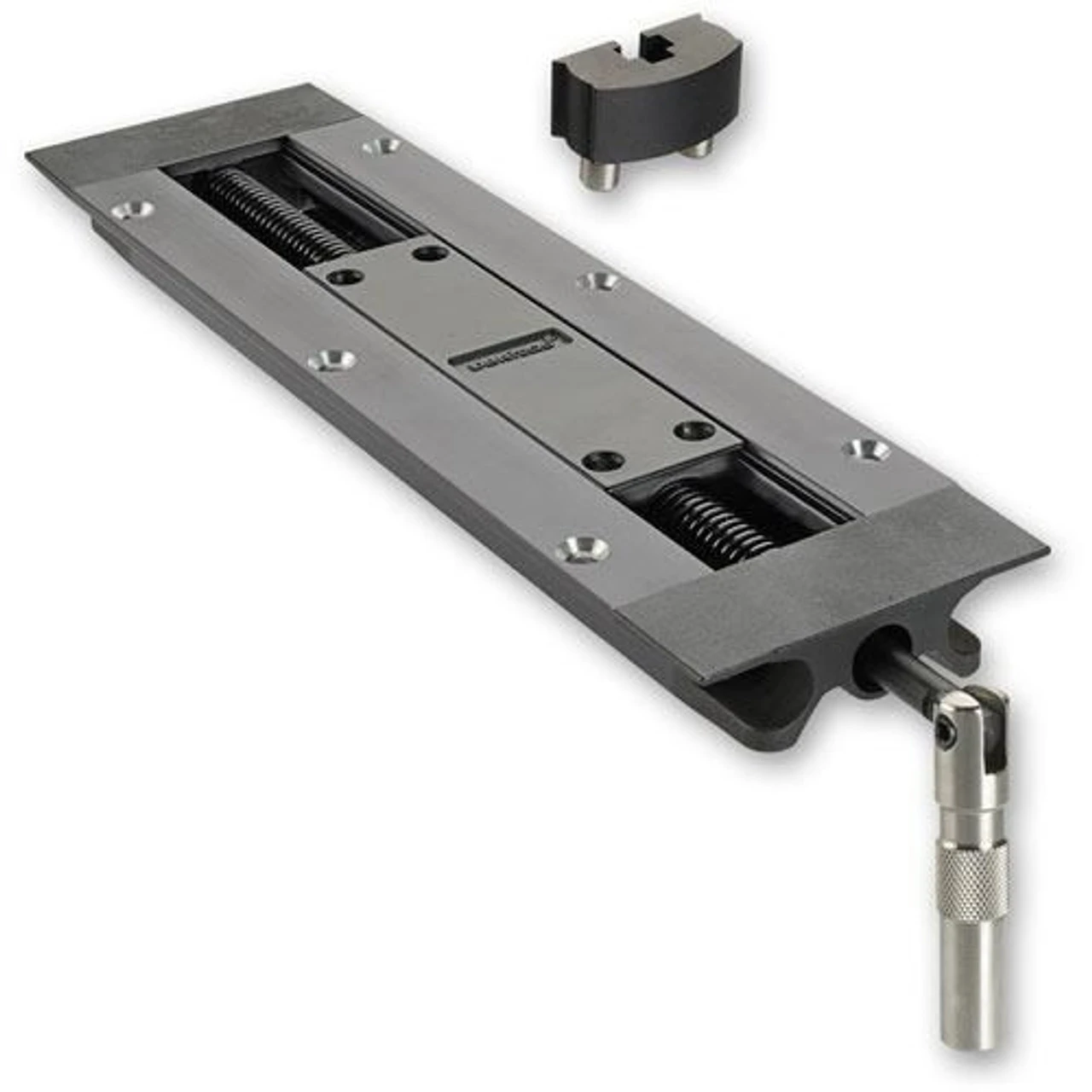 The vice fits flush to your bench top and functions in a similar manner to a wagon vice. If your bench doesn’t have a tail vice then the Veritas Inset Vice coupled with a row of dog holes and a bench dog is exactly what you need. A knurled stainless-steel toggle handle turns a 13mm diameter Acme-threaded steel rod giving a travel of up to 100mm to a moving plate. A 13mm tall dog locates into this plate in one of two positions. Two positions allowing you to have dog holes on your bench top as far apart as 195mm. When the vice is not in use, removing the jaw leaves you with an unobstructed work surface.