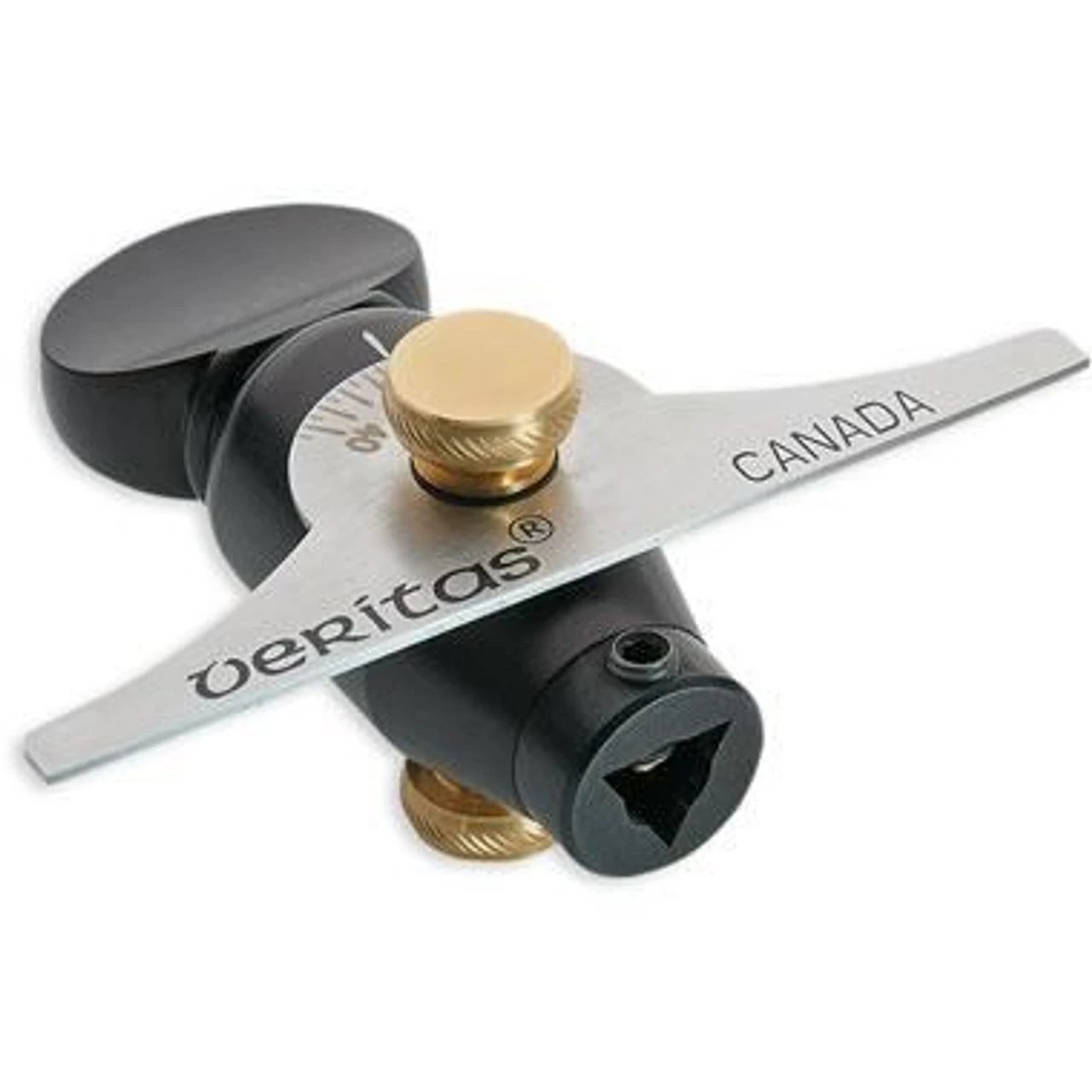 It has a rotating collar for setting a positive or negative rake angle up to 30 degree. The 75mm wide protractor helps set the fleam (or bevel) angle up to 45° left or right. The protractor is marked in 5 degree increments and the collar has a vernier scale marked in 1 degree increments. An O-ring inside the collar provides light resistance to the vernier scale making precision setting straightforward. It has an anodised aluminium body, stainless-steel protractor and brass thumbscrews. Its overall length measures 66mm.