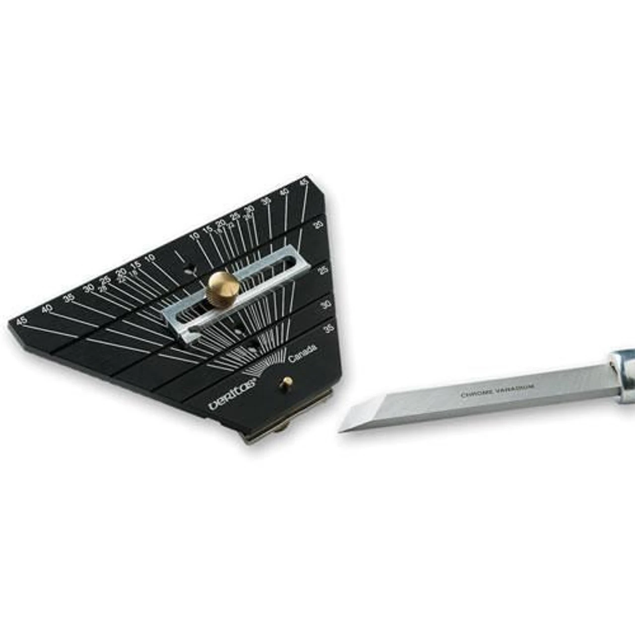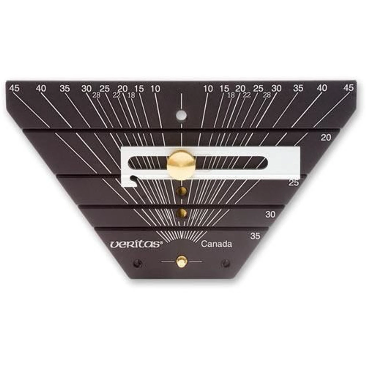 The Jig’s aluminium base has the angles laser-etched from 10 degrees to 45 degrees in 5-degree increments plus 18 degree, 22-degree and 28-degree marks.