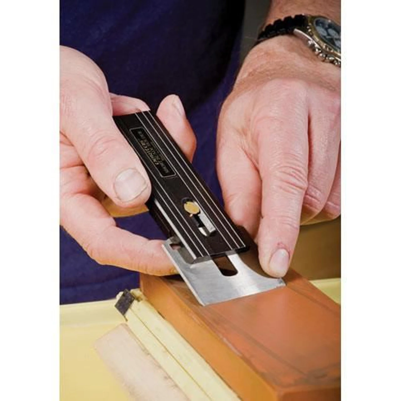 Because of the difficulty holding short blades such as those found in most spokeshaves, instrument makers’ planes, etc., sharpening them has been difficult.