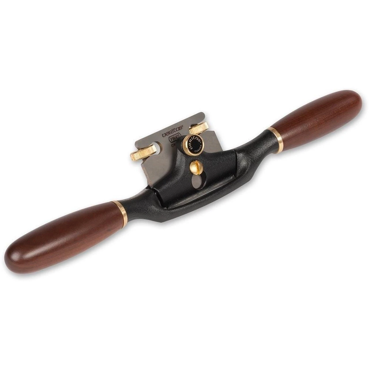 The 3.2mm(1/8″) thick PMV- 11 steel blade, machined lever cap and blade bed achieve chatter-free cutting in virtually all conditions. The ductile cast iron body is fitted with hardwood handles, shaped for comfort and control. The toe serves as a thumb rest allowing the user to choke up on the body to attain exceptional control for fine work. Twin adjustment wheels quickly and accurately control the cut depth and skew and shims let you adjust the mouth opening as needed.