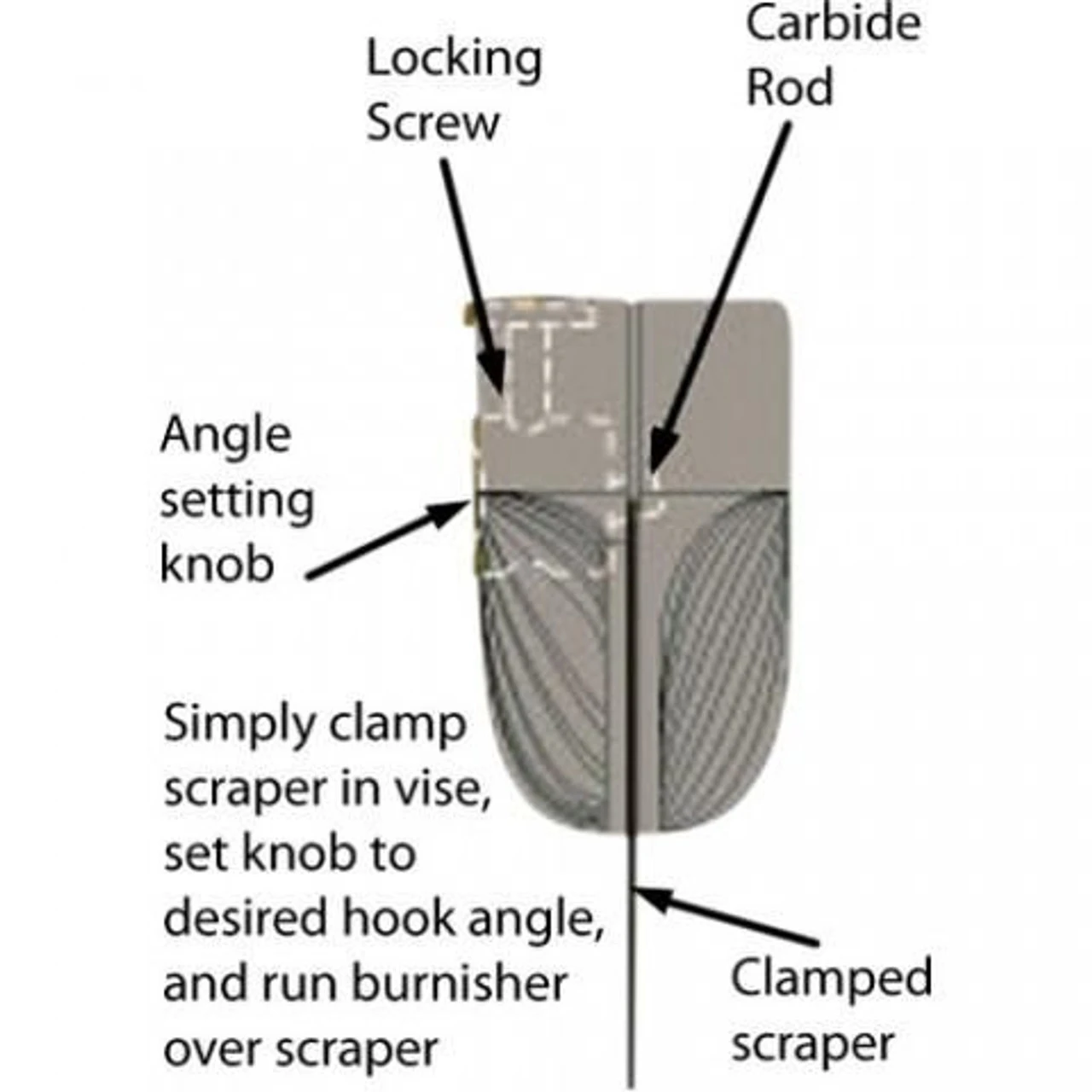 The burnisher has carbide rods fixed at an angle in a brass hub. The dial on the face allows the angle to be set anywhere between 0Â degree and 15Â degree. You rotate the knurled brass knob to your chosen angle and then lock it into place with the brass thumbscrew.