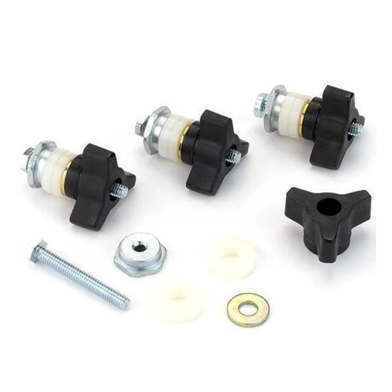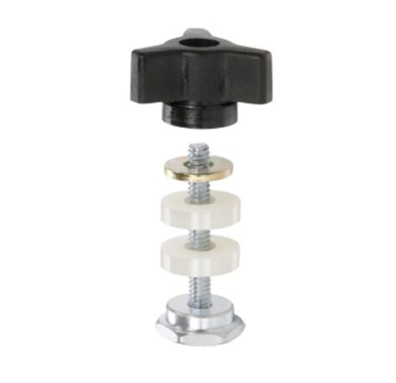 Turned from steel, zinc plated and sized to fit most standard 3/4 “x 3/8” miter channels in both table saws and router tables. The centered is drilled and tapped with 1/4 -20 threads and counter bored to fit the head of standard hex bolts. In fact it has room for standard diameter sockets as well.