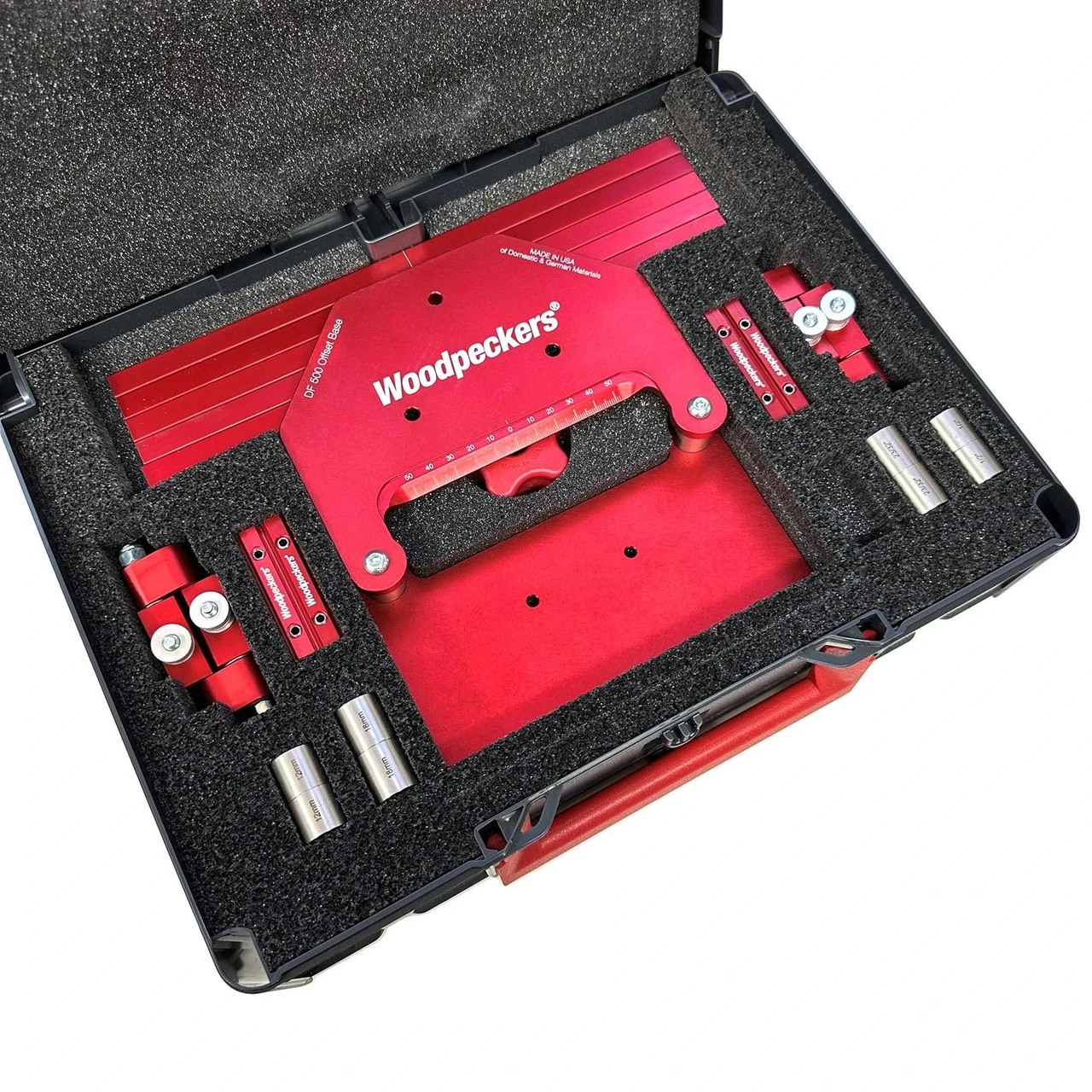 The Woodpeckers Offset Base System for Festool Domino simplifies centring Domino mortises in standard dimension material. Instead of sliding the Domino’s reference plate up and down, precision-milled spacers positively position a larger, more robust plate a specific distance from the centre of the cutter. No guesswork, no squinting to see a tiny scale, just pick the right set of spacers, place them between the base and the plate and start mortising. The plate can’t slip, even if you bang on it. Even better, if you have to make a replacement part for your project, just use the same spacers and the mortise position will be precisely the same.