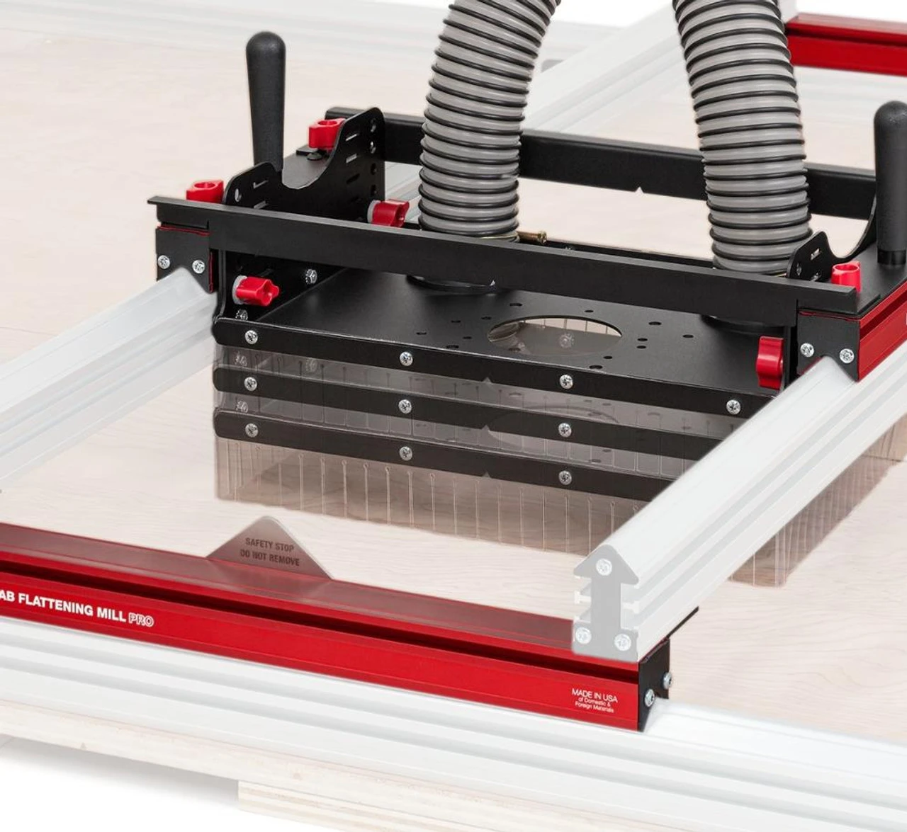 The router carriage is the main feature that sets the Woodpeckers Slab Flattening Mill Pro apart from the earlier Slab Flattening Mill. The new carriage adjusts in height by a full 63.5mm (2-1/2″). Depending on your router and router bit, you can work on stock just a fraction of an inch thick or up to 85.7mm (3-3/8″) without ever shimming either the rails or the slab.